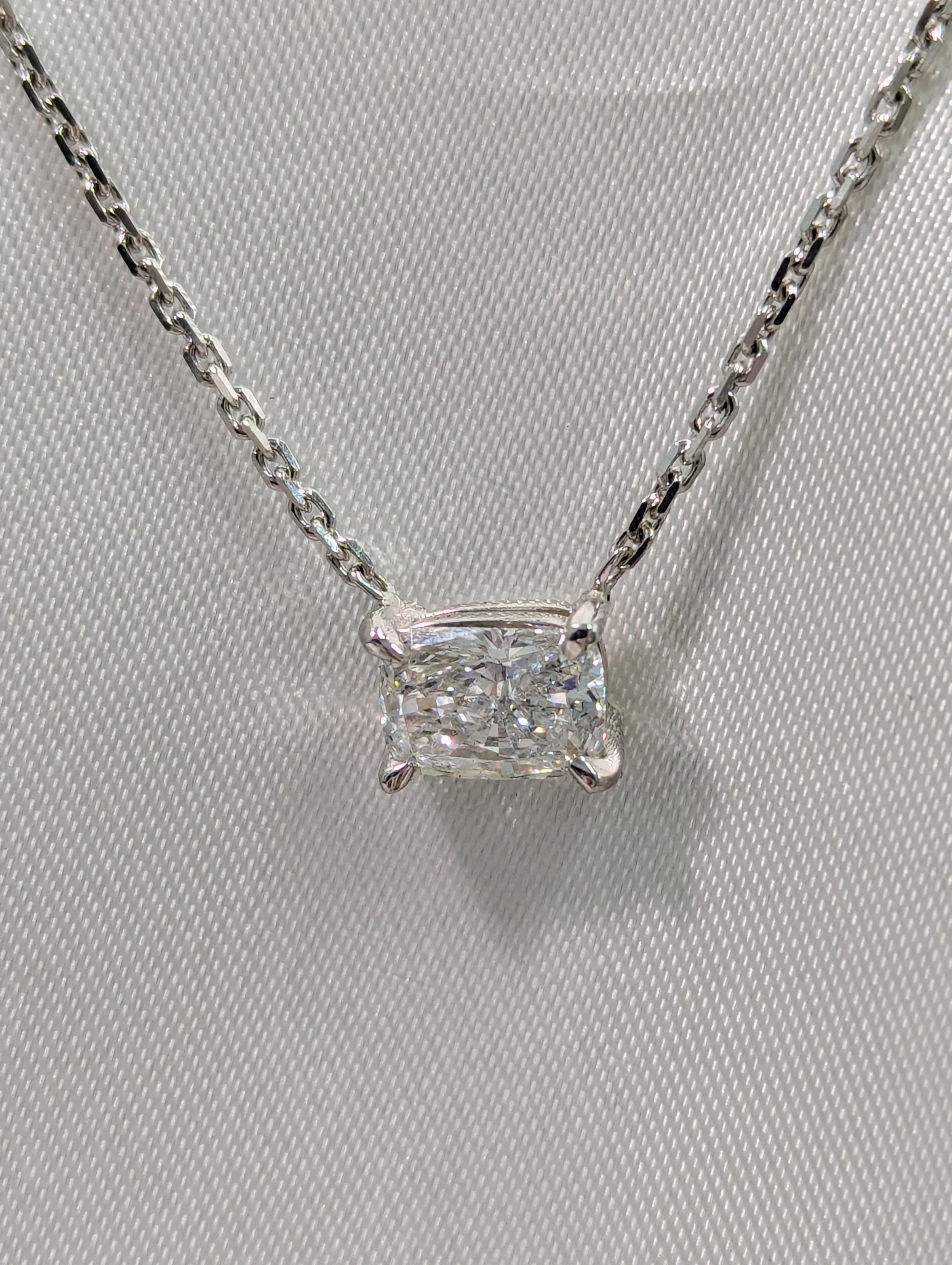 9Kt White Gold Lab Diamond Necklace set with 0.91Ct Cushion Cut Lab Diamond. Total Diamond Weight 0.91Ct F Colour SI1 Clarity. IGI Certified.
